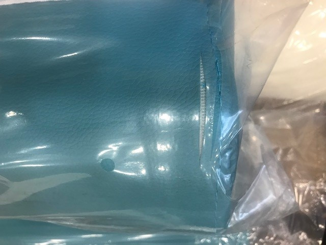 Értékcsökkenés oka: 3-4 cm hasadás a huzaton a sarokvarrás mellett, 2.3. képen látható